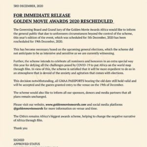 The 2020 edition of the annual Golden Movie Awards Africa has been rescheduled from December 5, 2020, to December 19.