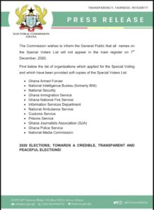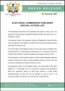 The Electoral Commission (EC) has announced the publication of the special voters’ list for the December 7 polls.