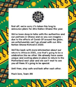 “We have been deep in talks with the authorities and partners in Ghana and as you can imagine – due to the effects of covid-19 around the globe, we, unfortunately, can’t go ahead with our afro nation Ghana festival in 2020,” the statement said.