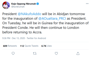 On Tuesday, December 15, 2020, President Akufo-Addo will make a trip to the Republic of Guinea for the inauguration of President Alpha Condé as well.
