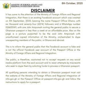 The Ministry also used the statement to caution the public not to accept requests on any social media platform from the said account and to resist attempts by miscreants who seek to dupe them by soliciting funds to process a Ghanaian passport.