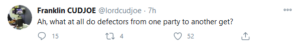 Taking to his Twitter page, Mr. Cudjoe said he could not fathom why a party member will just defect to another party as it has been the case for some months now as the country gears up for the December polls.