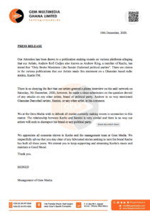 There is no denying the fact that our artiste granted a phone interview on the said network on Saturday, 5th December 2020, however, he made a clean submission on the question devoid of any attacks on any other artiste, brand, or political party. Andrew in no way mentioned Ghanaian Dancehall artiste, Samini, or any other artist, in his comment.