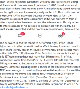 He wrote among others “…Meantime it is settled fact, for now, that EC officer in Techiman South did not collate (Form One C) as required by Regulation 43 of C.I. 127.