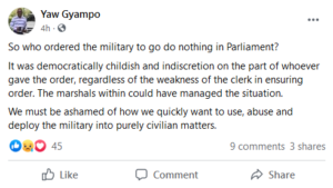 Professor Ransford Gyampo, a Political Science lecturer at the University of Ghana, is demanding to know who ordered the military to invade the Chamber of Parliament during a scuffle amongst the Members of Parliament.